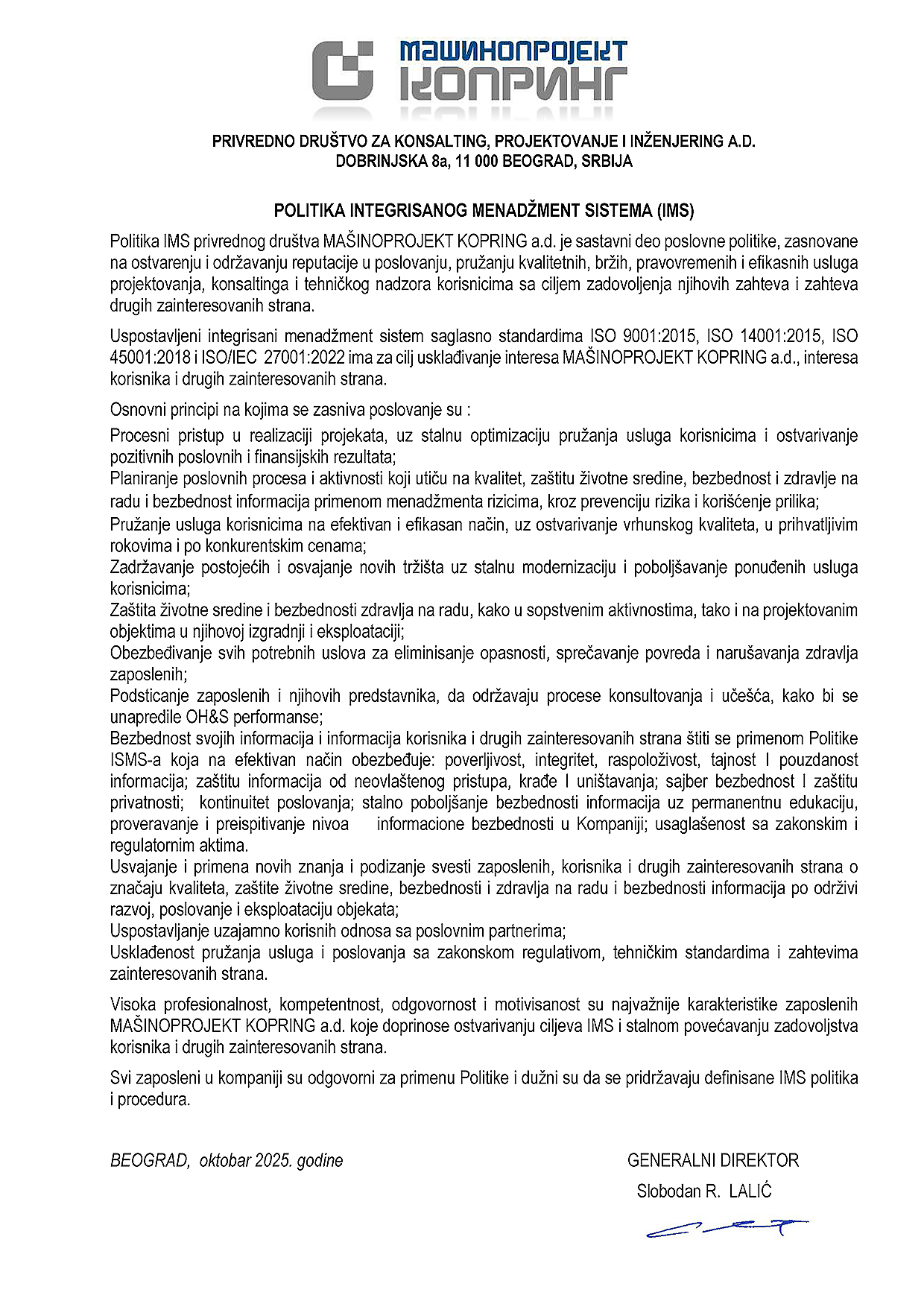 Mašinoprojekt KOPRING A.D. je kompanija iz oblasti građevinske industrije, koja svoju primarnu delatnost fokusira na usluge projektovanja, konsaltinga i inženjeringa, sa akcetnom na projektima visokogradnje. Osnovana je 1950. godine sa sedištem u Beogradu, a 1989. otvorila je svoju kancelariju u Moskvi, koja je u međuvremenu prerasla u preduzeće u inostranstvu.